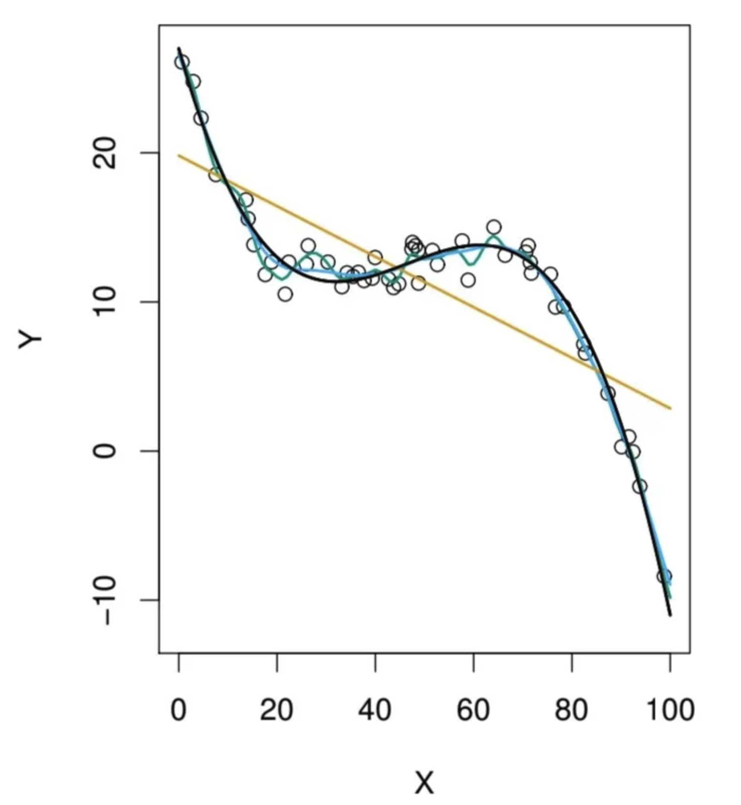그러면 최대한 많은 가능성을 고려해서 변수도 여러 개 넣고, 각 변수마다 로그나 Polynomial한 관계까지 고려한 모델을 만드는 것이 좋을까? 실제 함수에 비해 너무 울퉁불퉁한 모델이 만들어질 가능성이 높다.